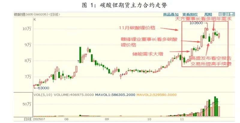 2025 年 11 月,碳酸锂期货价格呈现大幅上涨走势。在供需持续双增、市场 各种消息持续炒作以及交易所政策调控的反复交织下,碳酸锂价格在一波三折中 重心不断上移。 11 月初,受储能需求大增及下游需求旺盛拉动下,社会库存持续降库,从 10 月底 12.7 万吨下降至 12 万吨,碳酸锂价格在 8 万元获得支撑,大幅走强。 11 月 16 日的第十届动力电池应用国际峰会上,全球锂业巨头赣锋锂业董事 长李良彬抛出一则重磅预测:2026 年碳酸锂价格可能突破 15 万元/吨,甚至冲击 20 万元/吨,较当前价格翻倍。受讲话影响,11 月 17 日碳酸锂期货价格强势涨 停,一举突破年内高点,越过 9 万元大关。 11 月 18 日,广州期货交易所发布关于调整碳酸锂期货相关合约交易手续费 标准的通知,经研究决定,对碳酸锂期货相关合约的交易手续费标准作如下调整: 自 2025 年 11 月 20 日交易时起,碳酸锂期货 LC2601 合约的交易手续费标准调整 为成交金额的万分之一点二,日内平今仓交易手续费标准调整为成交金额的万分 之一点二。 11 月 21 日凌晨,高盛的分析师 Trina Chen 及其团队在报告中指出,尽管当 前锂市场基本面有所改善,但下游市场的短期反馈欠佳以及补库存速度的放缓, 已经让锂现货价格面临显著的下行风险。全球锂产能将在 2025 年下半年出现 12% 的短缺,但这一紧张局面将在 2026 年下半年彻底逆转,转为 10%的过剩。